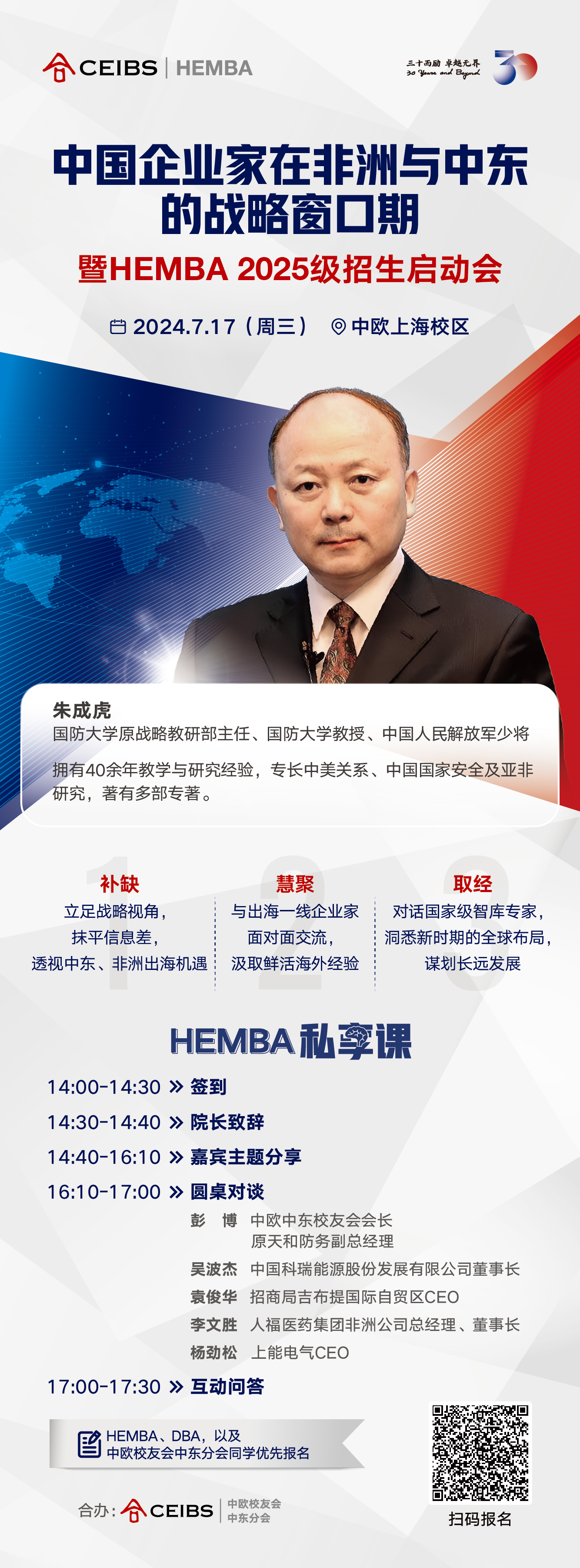 7月17日(星期三),HEMBA私享课携手中欧校友会中东分会,邀请国防大学原战略教研部主任、国防大学教授、中国人民解放军少将朱成虎将军分享他对于中国企业家出海中东和非洲的深度思考,站在战略层级,思考未来布局。更有多位深耕中东与非洲的企业家参与圆桌对谈,助力中国企业抓住真正的战略窗口期。