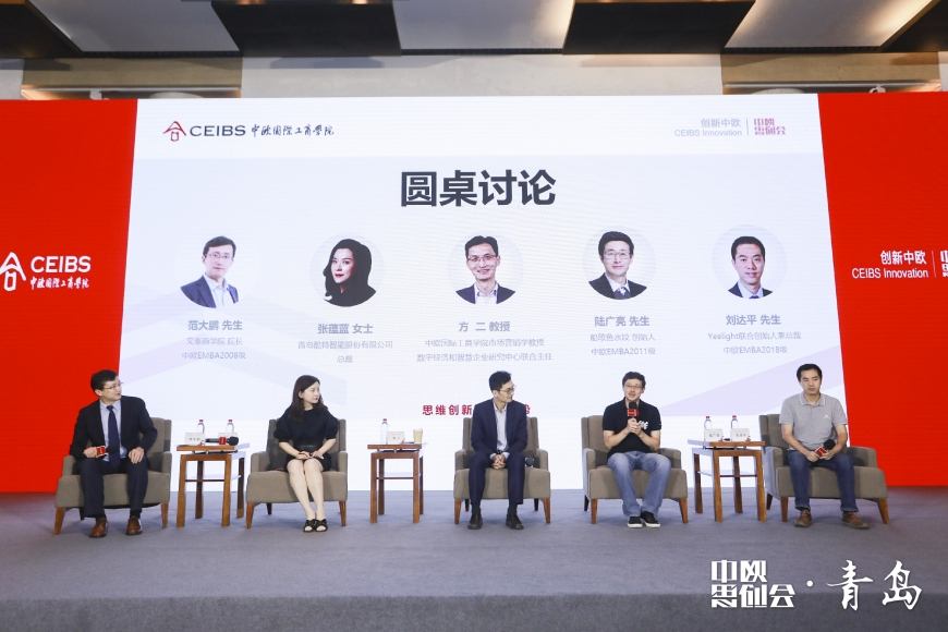 在圆桌论坛上,两位中欧EMBA校友企业家与方二教授、张蕴蓝女士一同探讨了产业互联网趋势下的企业转型。船歌鱼水饺创始人陆广亮(中欧EMBA2011)表示,船歌在传统餐饮中选择水饺进行产品创新,近几年又通过整合供应链和仓储物流,搭建“餐饮+零售”两大板块,并逐步打通线上线下业务数据;青岛亿联客(Yeelight)信息技术有限公司创始人刘达平(中欧EMBA2018)介绍了Yeelight深耕智能照明领域,进行技术创新和产品研发并加入小米生态链的创业历程。