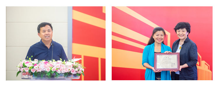 左图:马遇生先生致欢迎辞;右图:萧斌女士(右)向杨天蕙校友颁发捐赠证书