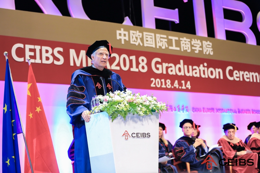2018年4月,法国前总理多米尼克·德维尔潘和中欧学生共聚一堂,在中欧上海校区举办的MBA毕业典礼上发表主题演讲,这是他首次作为中欧特聘教授出席学院活动。“中欧伙伴关系比以往显得更加重要。”德维尔潘表示,“我相信,欧洲人民将通过与中国的合作,来寻求答案以及和平的解决方案。”