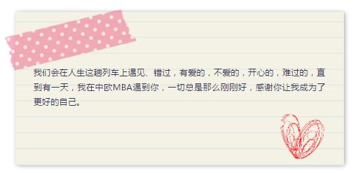 过去两年,我边工作边学习,日子过得充实而忙碌。记忆犹新的是第二学年选修课期间,我平日上班周末上课,下班以后还和同学们讨论毕业课题报告,连续两月无休。这种“酸爽”只有真正经历过的人才能体会。在中欧读书期间,最应该感谢的是我先生,谢谢他对我的支持和包容,谢谢他对家庭的更多付出才让我能够安心地学习和工作。
