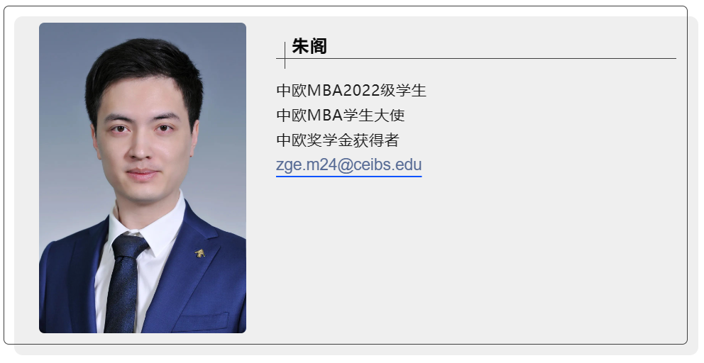 毕业后的第一家工作是在一家主营家电业务的国企从事销售和营销的工作,并取得过全国销售第一的成绩。大型企业完善的流程和制度很好地帮助我建立了对商业和管理的初步认知,之后我选择加入咨询行业,在营销和渠道拓展方面深耕。在几年工作之后,我开始创业的初尝试,但是结果却不尽人意,我也意识到自己在商业知识层面还有非常多的短板,需要系统地学习充电为之后的职业发展做准备,由此我萌生了就读MBA的想法,并选择了立足“中国深度、全球广度”的中欧MBA。