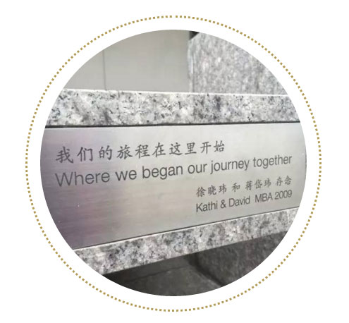 中欧使我们相遇,David捐赠给学校一块金属牌匾作为我们爱情的纪念。这块牌匾上面写着:“我们的旅程在这里开始,Where we began our journey together。”它嵌在3号宿舍前方的石凳上,那是我在念MBA时住的地方。