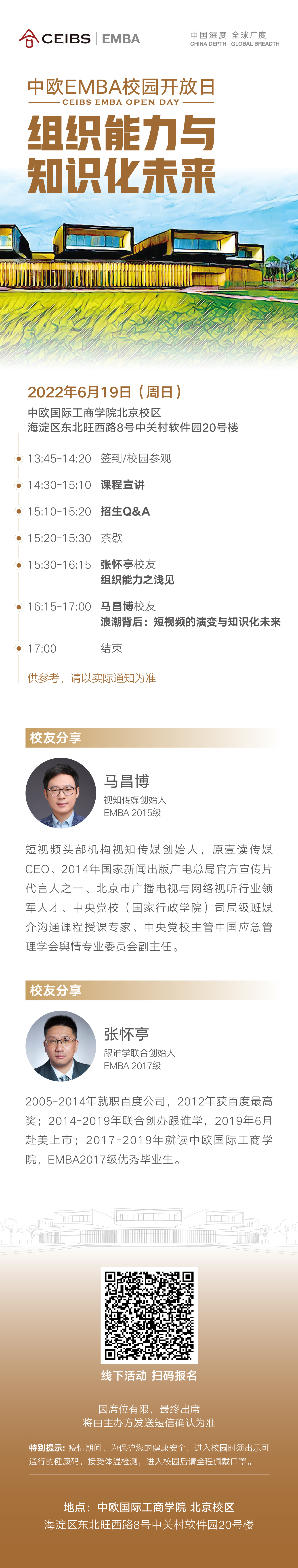 硕士课程(全日制) MBA 课程首页 课程介绍 课程概况 课程设计 一年快速学制 合作学位项目 综合战略咨询项目 实境教学中国模块 海外选修课 海外交换学习 校园生活 学生概况 学生生活 学生大使 学生会成员 学生故事 良师益友项目 申请和录取 申请条件 申请 费用和资助 MBA公开课 中欧MBA预录取 职业发展 公司招聘 学生职业发展支持 校友职业发展支持 校友分享 InnoLab创新创业中心 InnoLab创新创业中心 InnoLab活动 INNOVATEChina 活动预告 中欧MBA体验营 联系我们 管理硕士MiM MiM首页 课程介绍 课程设置 ESCP介绍 师资一览 申请指南 申请条件 申请流程 学费及奖学金 全球四大校区 中欧中国上海校区 ESCP法国巴黎校区 ESCP英国伦敦校区 中欧瑞士苏黎世校区 住宿信息 近期活动 联系我们 常见问题 硕士课程(非全日制) EMBA EMBA首页 课程介绍 课程体系 课程一览 国际师资 申请指南 申请流程 评估程序 学费信息 招生活动 同窗学友 同学画像 校友代表 EMBA资讯 国际视野 前沿观察 商业实践 人文智慧 EMBA影像 EMBA三十周年 常见问题 联系我们 Global EMBA Global EMBA首页 课程介绍 课程设计 课程设置 教学安排 师资教研 申请指南 申请流程 评估程序 学费信息 招生活动 同窗学友 学员概况 校友故事 课外生活 常见问题 联系我们 HEMBA HEMBA首页 课程介绍 课程缘起 课程设置 卓越师资 同窗学友 学员素描 课外生活 申请指南 申请流程 评估程序 学费信息 奖学金 新闻活动 联系我们 金融MBA FMBA一览 课程介绍 课程设置 授课安排 师资教研 良师益友 F4系列 社会责任 F课堂 FMBA影像 同窗学友 班级构成 学生素描 学生生活 学生故事 招生活动 申请报名 招生公告 申请条件 申请流程 学费信息 奖学金 常见问题 联系我们 在职MBA 在职MBA简介 课程介绍 申请指南 申请流程 学费及奖学金 招生活动 InnoLab 常见问题 博士课程 工商管理博士DBA DBA首页 课程设置 卓越师资 同窗学友 新闻活动 联系我们 PhD PhD首页 导师信息 招生简章 公告信息 联系我们 高管教育(非学位) 公开课程 公司定制课程 EMBA课程简章 欢迎您咨询中欧EMBA课程。请提供以下信息,我们的招生老师会尽快与您联系。 姓名 先生女士请输入姓名 手机 请输入手机 邮箱 请输入邮箱 全职工作经验(年) 请输入工作经验 公司 请输入公司 职位 请输入职位 所属区域 省份上海北京广东安徽澳门重庆福建甘肃广西贵州海南河北河南黑龙江湖北湖南吉林江苏江西辽宁内蒙古宁夏青海山东山西陕西四川台湾天津西藏香港新疆云南浙江请选择所属区域 公司规模 请选择<50人50-99人100-299人300-499人500-999人1000-4999人5000-9999人>10000人请选择公司规模 咨询班级 请选择上海班北京班深圳班请选择咨询班级 PrivacyPolicy 我已经阅读并同意隐私条款,同意通过本人提交的联系方式如电子邮件和电话接收中欧国际工商学院发送的课程信息和Newsletter等。我已知晓我拥有随时撤回同意的权利。 请同意隐私条款 我已经阅读并同意隐私条款,同意通过本人提交的联系方式如电子邮件和电话接收中欧国际工商学院发送的课程信息和Newsletter等。我已知晓我拥有随时撤回同意的权利。 Tracking code: 提交 相关链接 下载中心 学生门户 面包屑 首页 课程 硕士课程(非全日制) EMBA 招生活动 2022年06月19日 组织能力与知识化未来 | 中欧EMBA校园开放日 后退 打印友好页面