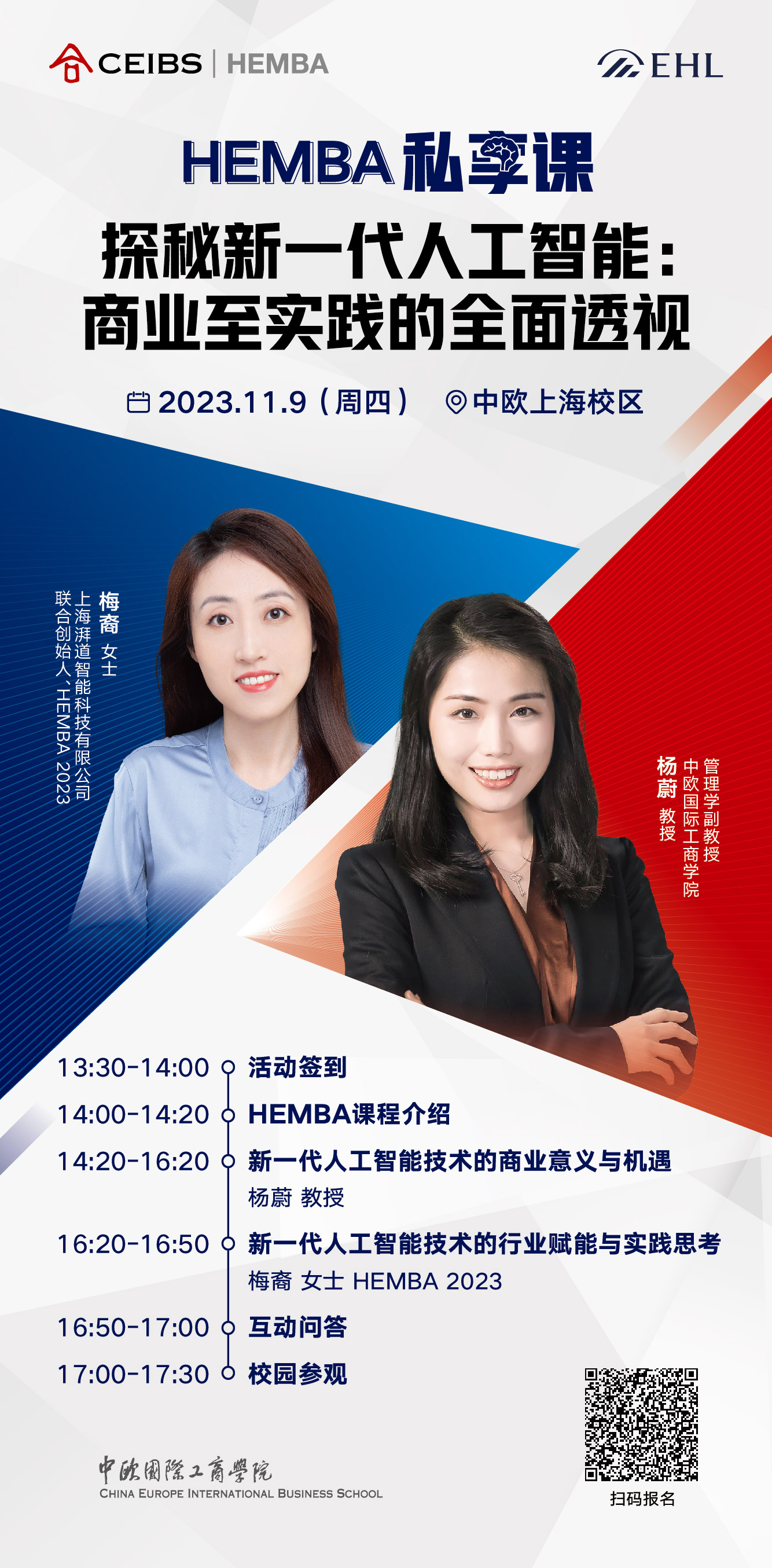 11月9日(周四),HEMBA私享课重磅来袭,中欧管理学副教授杨蔚将为企业家们深度解析“新一代人工智能技术的商业意义与机遇”;HEMBA 23级同学、湃道智能科技创始人梅裔,也将立足实践,分享“新一代人工智能技术的行业赋能与实践思考”,帮助企业家们在鼎沸的赛场背后,全面透视新一代人工智能的商业至实践。
