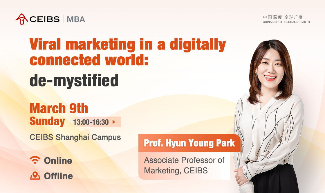 中欧MBA特邀市场营销学副教授朴玹煐推出本次活动:在公开课中,朴教授将从心理学、社会学、市场营销和计算机科学等多个领域,揭秘病毒式营销背后的真相。