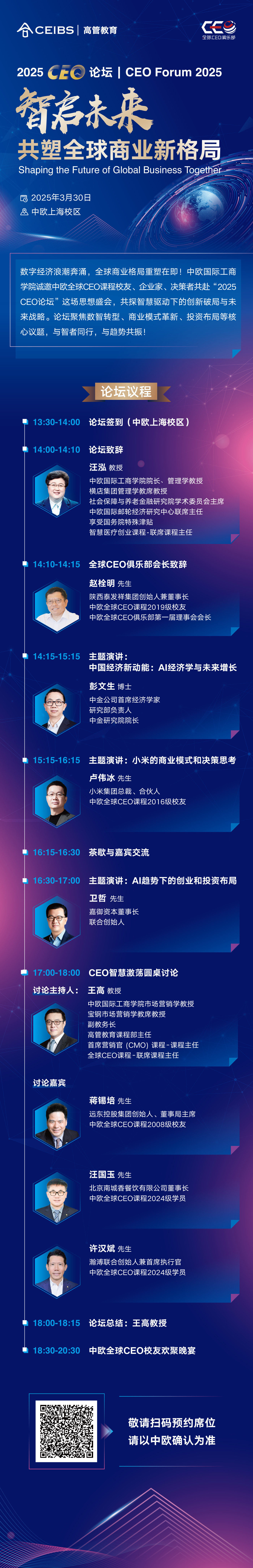 学院介绍 学院创办 院长致辞 里程碑 管理委员会 国际顾问委员会 公司顾问委员会 EMBA顾问委员会 认证排名 学院公告 公示和声明 招标中标公告 新闻中心 媒体聚焦 中欧故事 视频中心 中欧悦读 媒体联系人 关注我们 支持中欧 创始及永续会员 我要捐赠 捐赠项目 基金会年报 加入我们 联系我们 课程咨询 欢迎您咨询中欧国际工商学院高管教育课程。请您提供以下信息,我们的招生老师会尽快与您联系。 姓名 手机 邮箱 公司 职务 行业 行业农业商业咨询与服务化工/日化/石化电子/电器/电气金融/保险食品/饮料政府/社会机构医疗服务酒店/度假村/餐饮信息技术/通信服务制造业材料媒体/文化/体育/娱乐采矿业医药/医疗器械电力、热力生产和供应业地产/基建零售/批发/贸易纺织/服饰/皮具运输/物流交通工具与零部件水务/环境其他请选择所属行业 所属区域 省份北京市天津市甘肃省河北省黑龙江省河南省吉林省辽宁省山东省陕西省山西省青海省内蒙古宁夏西藏新疆上海市重庆市安徽省湖北省江西省江苏省四川省浙江省国外福建省广东省贵州省湖南省云南省海南省广西香港澳门台湾请选择所属区域 所需咨询的课程(请注明) PrivacyPolicy 我已经阅读并同意隐私条款,同意通过本人提交的联系方式如电子邮件和电话接收中欧国际工商学院发送的课程信息和Newsletter等。我已知晓我拥有随时撤回同意的权利。 请同意隐私条款 我已经阅读并同意隐私条款,同意通过本人提交的联系方式如电子邮件和电话接收中欧国际工商学院发送的课程信息和Newsletter等。我已知晓我拥有随时撤回同意的权利。 Tracking code: 提交 报名指南 面包屑 首页 活动 2025年03月30日 2025CEO论坛|智启未来共塑全球商业新格局 后退 打印友好页面