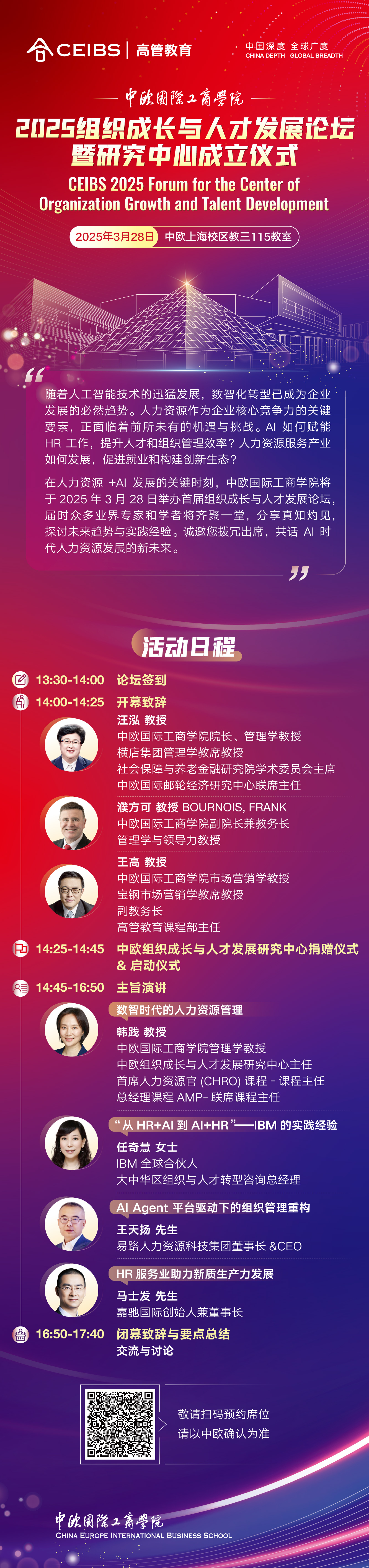 学院介绍 学院创办 院长致辞 里程碑 管理委员会 国际顾问委员会 公司顾问委员会 EMBA顾问委员会 认证排名 学院公告 公示和声明 招标中标公告 新闻中心 媒体聚焦 中欧故事 视频中心 中欧悦读 媒体联系人 关注我们 支持中欧 创始及永续会员 我要捐赠 捐赠项目 基金会年报 加入我们 联系我们 课程咨询 欢迎您咨询中欧国际工商学院高管教育课程。请您提供以下信息,我们的招生老师会尽快与您联系。 姓名 手机 邮箱 公司 职务 行业 行业农业商业咨询与服务化工/日化/石化电子/电器/电气金融/保险食品/饮料政府/社会机构医疗服务酒店/度假村/餐饮信息技术/通信服务制造业材料媒体/文化/体育/娱乐采矿业医药/医疗器械电力、热力生产和供应业地产/基建零售/批发/贸易纺织/服饰/皮具运输/物流交通工具与零部件水务/环境其他请选择所属行业 所属区域 省份北京市天津市甘肃省河北省黑龙江省河南省吉林省辽宁省山东省陕西省山西省青海省内蒙古宁夏西藏新疆上海市重庆市安徽省湖北省江西省江苏省四川省浙江省国外福建省广东省贵州省湖南省云南省海南省广西香港澳门台湾请选择所属区域 所需咨询的课程(请注明) PrivacyPolicy 我已经阅读并同意隐私条款,同意通过本人提交的联系方式如电子邮件和电话接收中欧国际工商学院发送的课程信息和Newsletter等。我已知晓我拥有随时撤回同意的权利。 请同意隐私条款 我已经阅读并同意隐私条款,同意通过本人提交的联系方式如电子邮件和电话接收中欧国际工商学院发送的课程信息和Newsletter等。我已知晓我拥有随时撤回同意的权利。 Tracking code: 提交 报名指南 面包屑 首页 活动 2025年03月28日 2025组织成长与人才发展论坛暨研究中心成立仪式 后退 打印友好页面