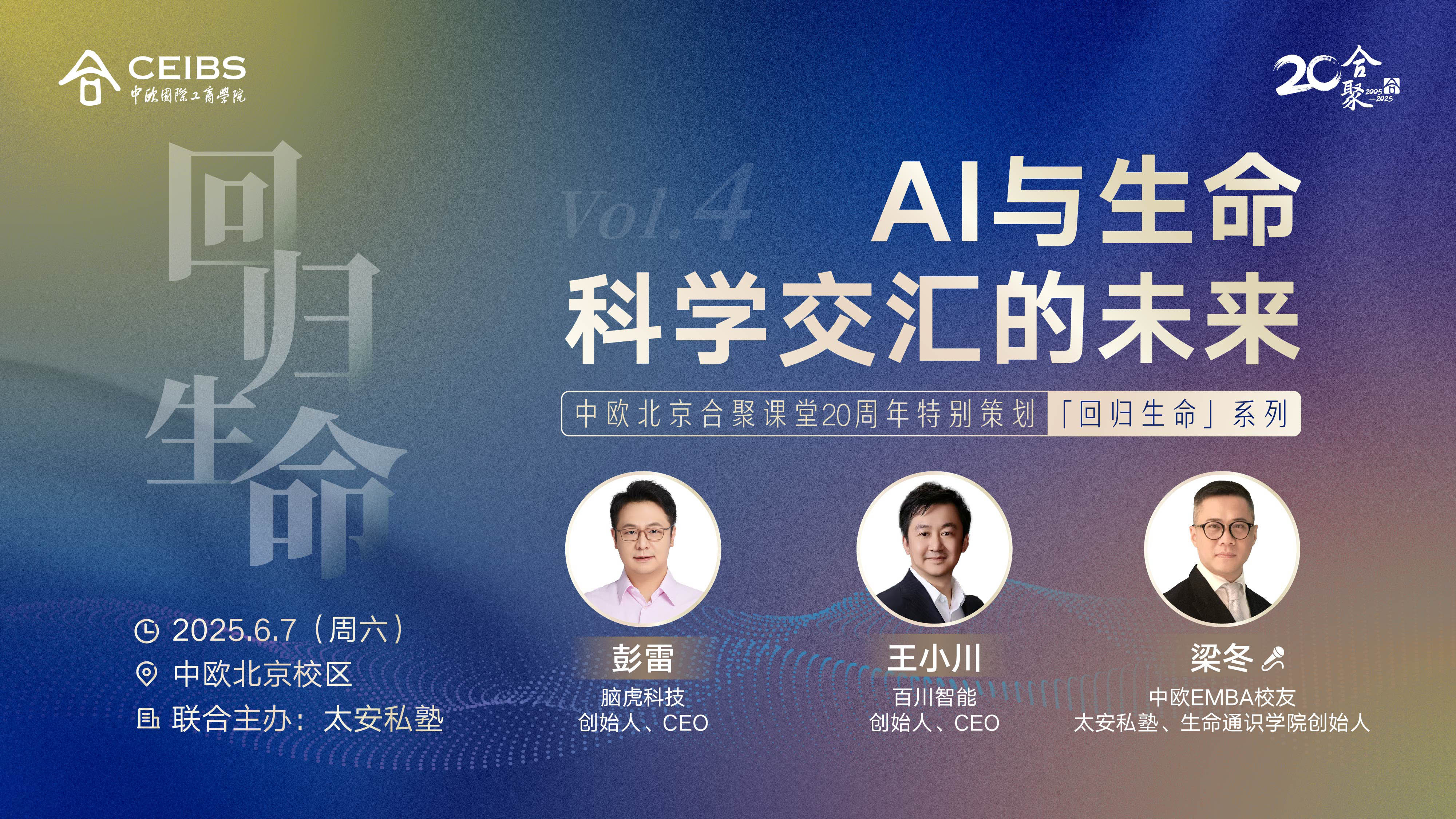 6月7日,中欧合聚课堂「回归生命」系列将在北京校区开启第四期,聚焦AI与生命科学的交汇,邀请到在脑机接口领域和医疗大模型领域的先锋探索者——脑虎科技创始人、CEO彭雷与百川智能创始人、CEO王小川分别主讲;太安私塾和生命通识学院创始人梁冬(中欧EMBA校友)将与他们开展两场对话。