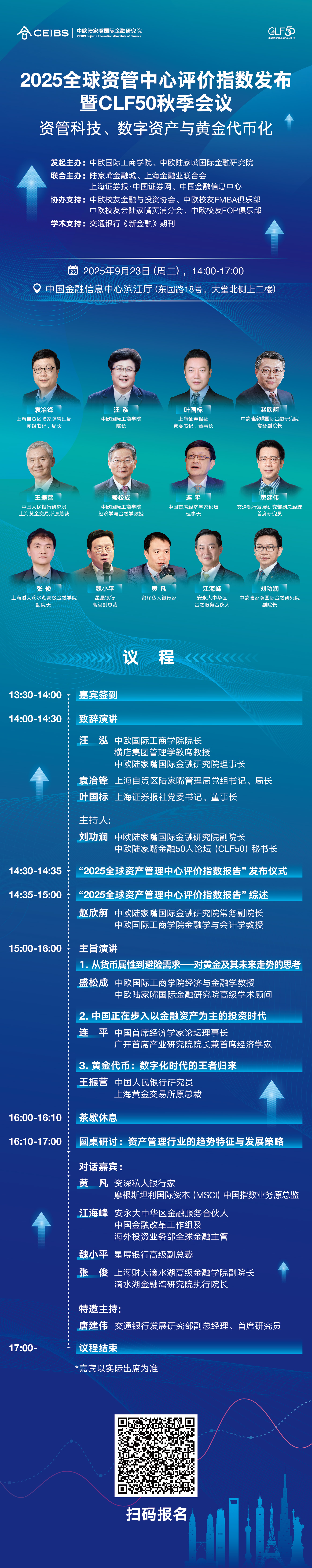 学院介绍 学院创办 院长致辞 里程碑 管理委员会 国际顾问委员会 公司顾问委员会 EMBA顾问委员会 认证排名 学院公告 公示和声明 招标中标公告 新闻中心 媒体聚焦 中欧故事 视频中心 中欧悦读 媒体联系人 关注我们 支持中欧 创始及永续会员 我要捐赠 捐赠项目 基金会年报 加入我们 联系我们 课程咨询 中欧建院30周年办学成果展 与你云端相见! 面包屑 首页 活动 2025年09月23日 2025全球资管中心评价指数发布暨CLF50秋季会议——资管科技、数字资产与黄金代币化 后退 打印友好页面
