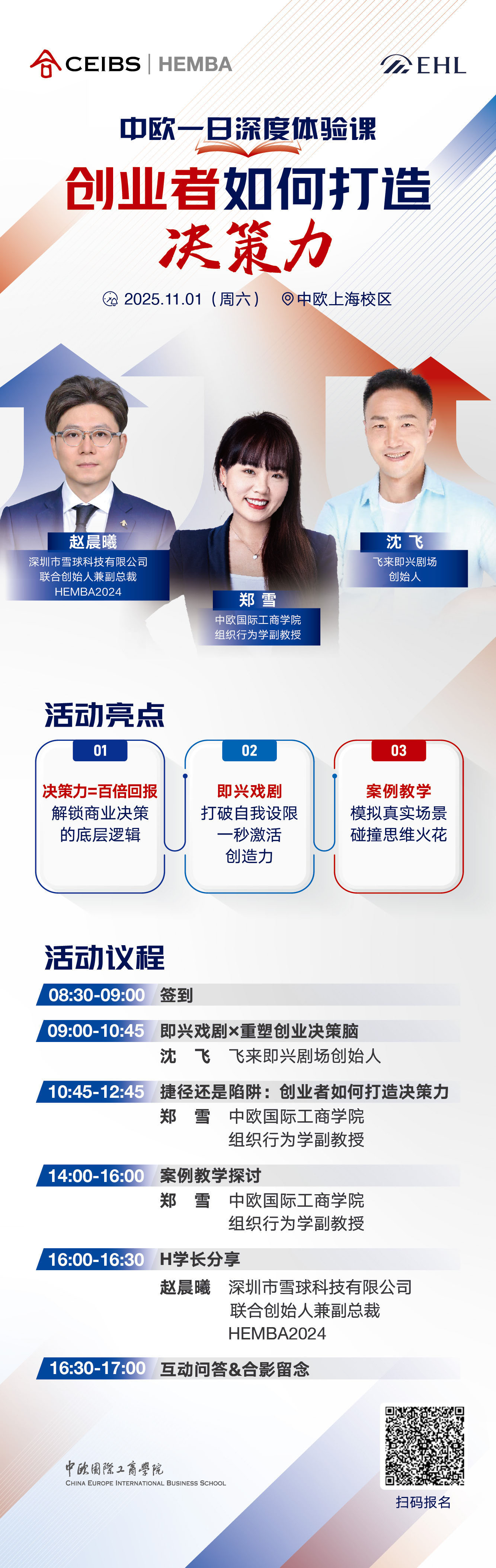 学院介绍 学院创办 院长致辞 里程碑 管理委员会 国际顾问委员会 公司顾问委员会 EMBA顾问委员会 认证排名 学院公告 公示和声明 招标中标公告 新闻中心 媒体聚焦 中欧故事 视频中心 中欧悦读 媒体联系人 关注我们 支持中欧 创始及永续会员 我要捐赠 捐赠项目 基金会年报 加入我们 联系我们 HEMBA课程咨询 欢迎您咨询中欧HEMBA课程。请您提供以下信息,我们的招生老师会尽快与您联系。 姓名 手机 邮箱 公司 职务 工作年限 最高学历 中欧校友 是 否 PrivacyPolicy 我已经阅读并同意隐私条款,同意通过本人提交的联系方式如电子邮件和电话接收中欧国际工商学院发送的课程信息和Newsletter等。我已知晓我拥有随时撤回同意的权利。 请同意隐私条款 我已经阅读并同意隐私条款,同意通过本人提交的联系方式如电子邮件和电话接收中欧国际工商学院发送的课程信息和Newsletter等。我已知晓我拥有随时撤回同意的权利。 Tracking code: 提交 我要咨询 申请流程 联系我们 我要咨询 欢迎您咨询中欧HEMBA课程。请您提供以下信息,我们的招生老师会尽快与您联系。 姓名 手机 邮箱 公司 职务 工作年限 最高学历 中欧校友 是 否 PrivacyPolicy 我已经阅读并同意隐私条款同意通过本人提交的联系方式如电子邮件和电话接收中欧国际工商学院发送的课程信息和Newsletter等。我已知晓我拥有随时撤回同意的权利。 请同意隐私条款 Tracking code: 提交 相关链接 走进卓越社群 报名热线:021-2890 5556 电子邮箱:hemba@ceibs.edu 面包屑 首页 活动 2025年11月01日 中欧HEMBA深度体验课:创业者如何打造决策力 后退 打印友好页面 2026级招生中 ▶▷立即报名