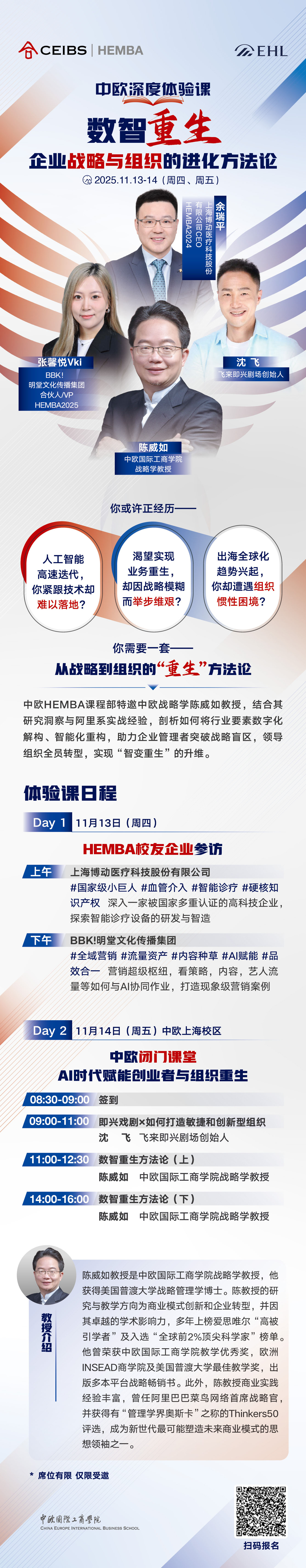 学院介绍 学院创办 院长致辞 里程碑 管理委员会 国际顾问委员会 公司顾问委员会 EMBA顾问委员会 认证排名 学院公告 公示和声明 招标中标公告 新闻中心 媒体聚焦 中欧故事 视频中心 中欧悦读 媒体联系人 关注我们 支持中欧 创始及永续会员 我要捐赠 捐赠项目 基金会年报 加入我们 联系我们 HEMBA课程咨询 欢迎您咨询中欧HEMBA课程。请您提供以下信息,我们的招生老师会尽快与您联系。 姓名 手机 邮箱 公司 职务 工作年限 最高学历 中欧校友 是 否 PrivacyPolicy 我已经阅读并同意隐私条款,同意通过本人提交的联系方式如电子邮件和电话接收中欧国际工商学院发送的课程信息和Newsletter等。我已知晓我拥有随时撤回同意的权利。 请同意隐私条款 我已经阅读并同意隐私条款,同意通过本人提交的联系方式如电子邮件和电话接收中欧国际工商学院发送的课程信息和Newsletter等。我已知晓我拥有随时撤回同意的权利。 Tracking code: 提交 我要咨询 申请流程 联系我们 我要咨询 欢迎您咨询中欧HEMBA课程。请您提供以下信息,我们的招生老师会尽快与您联系。 姓名 手机 邮箱 公司 职务 工作年限 最高学历 中欧校友 是 否 PrivacyPolicy 我已经阅读并同意隐私条款同意通过本人提交的联系方式如电子邮件和电话接收中欧国际工商学院发送的课程信息和Newsletter等。我已知晓我拥有随时撤回同意的权利。 请同意隐私条款 Tracking code: 提交 相关链接 走进卓越社群 报名热线:021-2890 5556 电子邮箱:hemba@ceibs.edu 面包屑 首页 活动 2025年11月13日 中欧HEMBA深度体验课:数智重生——企业战略与组织的进化方法论 后退 打印友好页面 2026级招生中 ▶▷立即报名