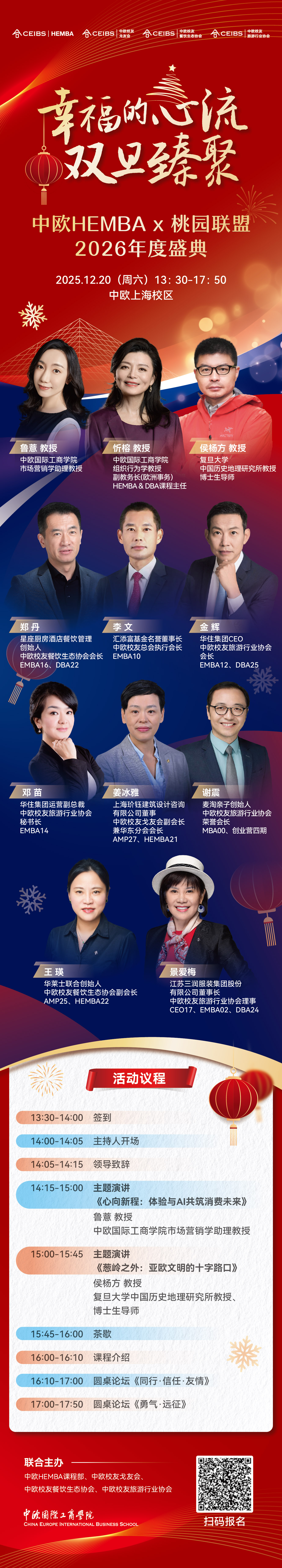 学院介绍 学院创办 院长致辞 里程碑 管理委员会 国际顾问委员会 公司顾问委员会 EMBA顾问委员会 认证排名 学院公告 公示和声明 招标中标公告 新闻中心 媒体聚焦 中欧故事 视频中心 中欧悦读 媒体联系人 关注我们 支持中欧 创始及永续会员 我要捐赠 捐赠项目 基金会年报 加入我们 联系我们 HEMBA课程咨询 欢迎您咨询中欧HEMBA课程。请您提供以下信息,我们的招生老师会尽快与您联系。 姓名 手机 邮箱 公司 职务 工作年限 最高学历 中欧校友 是 否 PrivacyPolicy 我已经阅读并同意隐私条款,同意通过本人提交的联系方式如电子邮件和电话接收中欧国际工商学院发送的课程信息和Newsletter等。我已知晓我拥有随时撤回同意的权利。 请同意隐私条款 我已经阅读并同意隐私条款,同意通过本人提交的联系方式如电子邮件和电话接收中欧国际工商学院发送的课程信息和Newsletter等。我已知晓我拥有随时撤回同意的权利。 Tracking code: 提交 我要咨询 申请流程 联系我们 我要咨询 欢迎您咨询中欧HEMBA课程。请您提供以下信息,我们的招生老师会尽快与您联系。 姓名 手机 邮箱 公司 职务 工作年限 最高学历 中欧校友 是 否 PrivacyPolicy 我已经阅读并同意隐私条款同意通过本人提交的联系方式如电子邮件和电话接收中欧国际工商学院发送的课程信息和Newsletter等。我已知晓我拥有随时撤回同意的权利。 请同意隐私条款 Tracking code: 提交 相关链接 走进卓越社群 报名热线:021-2890 5556 电子邮箱:hemba@ceibs.edu 面包屑 首页 活动 2025年12月20日 幸福的心流·双旦臻聚 2026年度盛典 后退 打印友好页面 2026级招生中 ▶▷立即报名