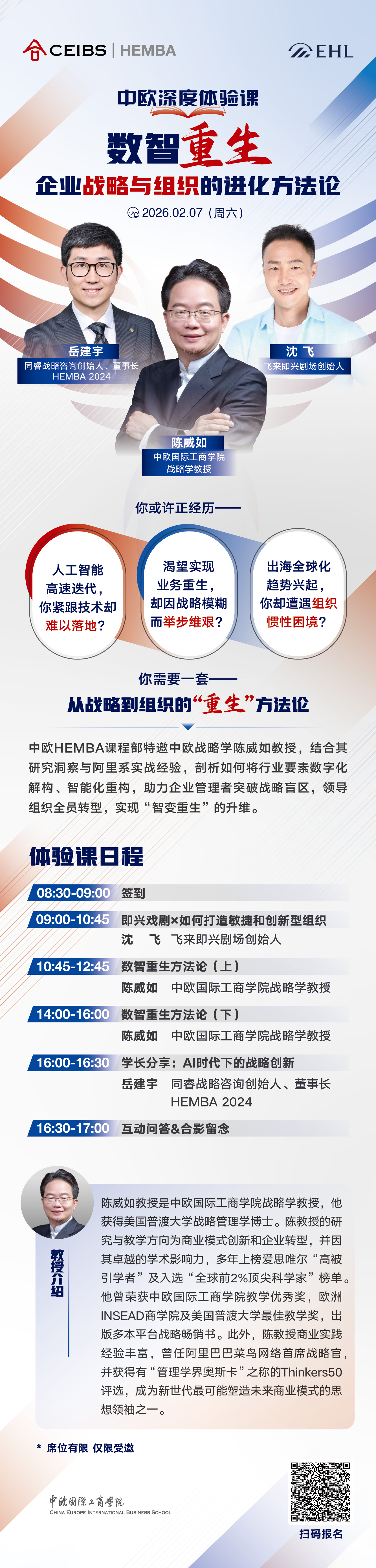 学院介绍 学院创办 院长致辞 里程碑 管理委员会 国际顾问委员会 公司顾问委员会 EMBA顾问委员会 认证排名 学院公告 公示和声明 招标中标公告 新闻中心 媒体聚焦 中欧故事 视频中心 中欧悦读 媒体联系人 关注我们 支持中欧 创始及永续会员 我要捐赠 捐赠项目 基金会年报 加入我们 联系我们 HEMBA课程咨询 欢迎您咨询中欧HEMBA课程。请您提供以下信息,我们的招生老师会尽快与您联系。 姓名 手机 邮箱 公司 职务 工作年限 最高学历 中欧校友 是 否 PrivacyPolicy 我已经阅读并同意隐私条款,同意通过本人提交的联系方式如电子邮件和电话接收中欧国际工商学院发送的课程信息和Newsletter等。我已知晓我拥有随时撤回同意的权利。 请同意隐私条款 我已经阅读并同意隐私条款,同意通过本人提交的联系方式如电子邮件和电话接收中欧国际工商学院发送的课程信息和Newsletter等。我已知晓我拥有随时撤回同意的权利。 Tracking code: 提交 我要咨询 申请流程 联系我们 我要咨询 欢迎您咨询中欧HEMBA课程。请您提供以下信息,我们的招生老师会尽快与您联系。 姓名 手机 邮箱 公司 职务 工作年限 最高学历 中欧校友 是 否 PrivacyPolicy 我已经阅读并同意隐私条款同意通过本人提交的联系方式如电子邮件和电话接收中欧国际工商学院发送的课程信息和Newsletter等。我已知晓我拥有随时撤回同意的权利。 请同意隐私条款 Tracking code: 提交 相关链接 走进卓越社群 报名热线:021-2890 5556 电子邮箱:hemba@ceibs.edu 面包屑 首页 活动 2026年02月07日 中欧HEMBA深度体验课:数智重生——企业战略与组织的进化方法论 后退 打印友好页面 2026级招生中 ▶▷立即报名
