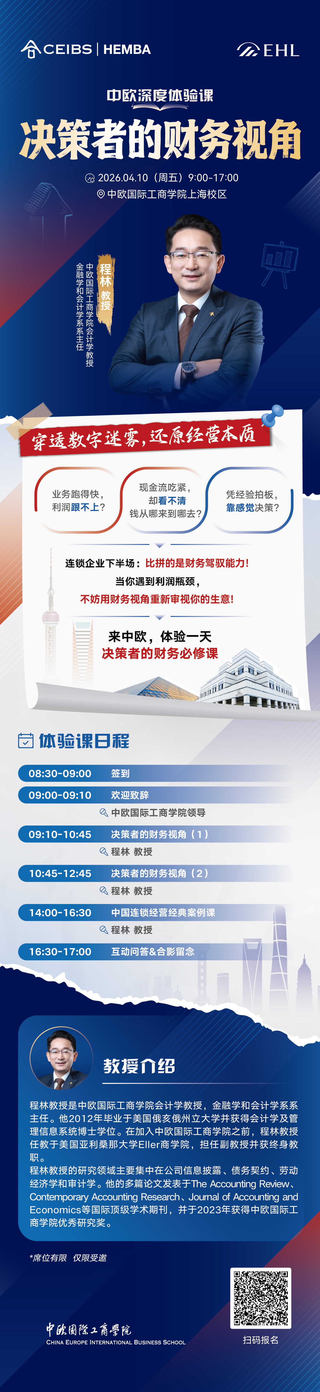 学院介绍 学院创办 院长致辞 里程碑 管理委员会 国际顾问委员会 公司顾问委员会 EMBA顾问委员会 认证排名 学院公告 公示和声明 招标中标公告 新闻中心 媒体聚焦 中欧故事 视频中心 中欧悦读 媒体联系人 关注我们 支持中欧 创始及永续会员 我要捐赠 捐赠项目 基金会年报 加入我们 联系我们 HEMBA课程咨询 欢迎您咨询中欧HEMBA课程。请您提供以下信息,我们的招生老师会尽快与您联系。 姓名 手机 邮箱 公司 职务 工作年限 最高学历 中欧校友 是 否 PrivacyPolicy 我已经阅读并同意隐私条款,同意通过本人提交的联系方式如电子邮件和电话接收中欧国际工商学院发送的课程信息和Newsletter等。我已知晓我拥有随时撤回同意的权利。 请同意隐私条款 我已经阅读并同意隐私条款,同意通过本人提交的联系方式如电子邮件和电话接收中欧国际工商学院发送的课程信息和Newsletter等。我已知晓我拥有随时撤回同意的权利。 Tracking code: 提交 我要咨询 申请流程 联系我们 我要咨询 欢迎您咨询中欧HEMBA课程。请您提供以下信息,我们的招生老师会尽快与您联系。 姓名 手机 邮箱 公司 职务 工作年限 最高学历 中欧校友 是 否 PrivacyPolicy 我已经阅读并同意隐私条款同意通过本人提交的联系方式如电子邮件和电话接收中欧国际工商学院发送的课程信息和Newsletter等。我已知晓我拥有随时撤回同意的权利。 请同意隐私条款 Tracking code: 提交 相关链接 走进卓越社群 报名热线:021-2890 5556 电子邮箱:hemba@ceibs.edu 面包屑 首页 活动 2026年04月10日 中欧HEMBA深度体验课 | 决策者的财务视角 后退 打印友好页面 2026级招生中 ▶▷立即报名