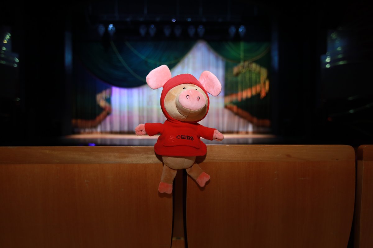 晚上六点过后,上海文化广场音乐剧签到处已人山人海,校友关系事务部团队早已用6小时时间将剧场精心布置为中欧主场。候场期间剧场沿途道旗,内部吊旗及随处可见的中欧元素成了拍照打卡点,特别定制的中欧传统新年吉祥物——呆萌小猪也深受大家喜爱,大家纷纷在背景墙前合影,期待精彩开始。