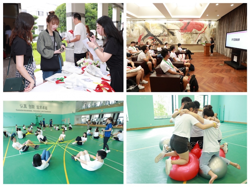 在开营仪式上,校友关系事务部主任傅丹阳老师致欢迎辞,对学员们表示了热烈的欢迎,并预祝他们在本次夏令营中学有所获,满载而归。仪式结束后,学员们前往体育馆进行团队破冰活动,在弹力带、瑜伽球等团队协作项目中,学员们快速融入了团队,彼此间也开始慢慢熟悉,找到了默契。