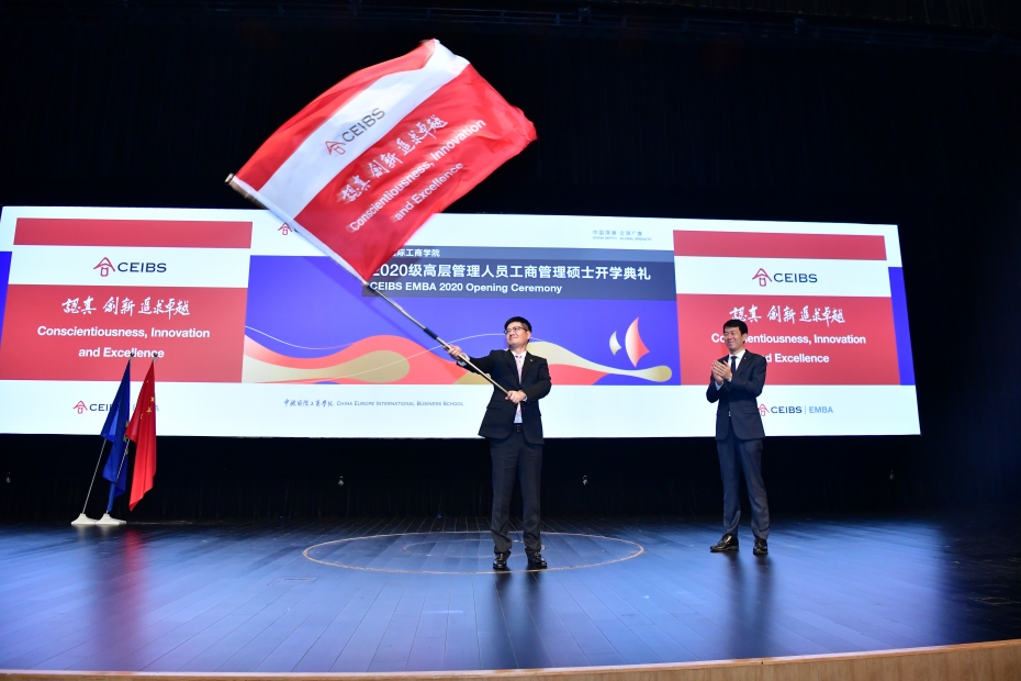 典礼最后,学长代表陈华、朱振友分别将象征中欧精神的旗帜交给了新生代表王颂峰、刘丽娜,2020级春季班的EMBA新同学将把“认真、创新、追求卓越”的中欧精神继续传承发扬。