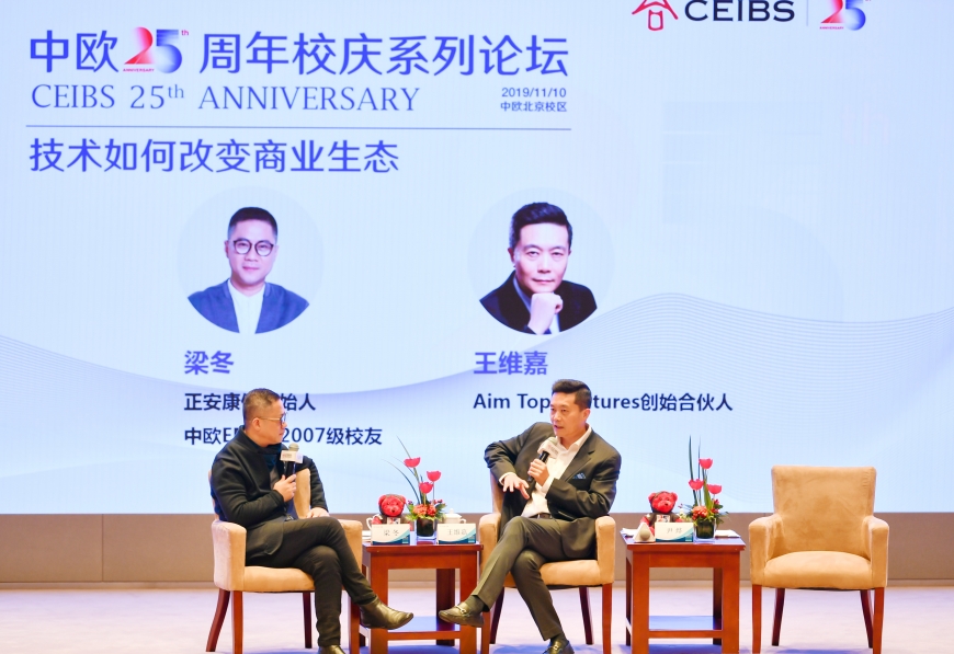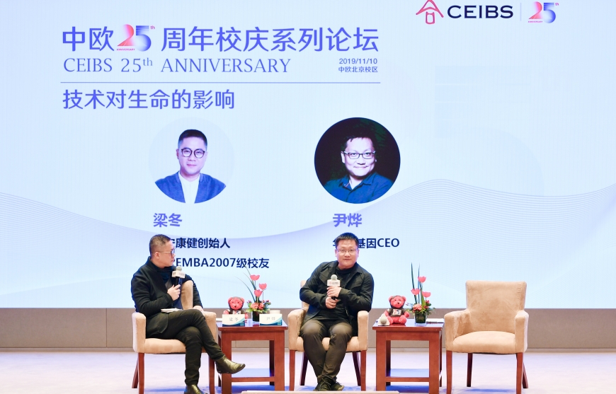 2019年11月10日,中欧国际工商学院北京校区举办25周年校庆论坛科技专场,正安康健创始人、冬吴文化创始人梁冬,华大基因CEO尹烨,硅谷风险投资公司Aim Top Ventures创始合伙人王维嘉共同出席。在梁冬的主持下,对话以“科技、商业与未来”为主题,深入探讨生物科学、人工智能等前沿科技发展的可能性、商业应用和对未来的影响。中欧国际工商学院欧方院长迪帕克·杰恩、副院长张维炯出席论坛并致辞。
