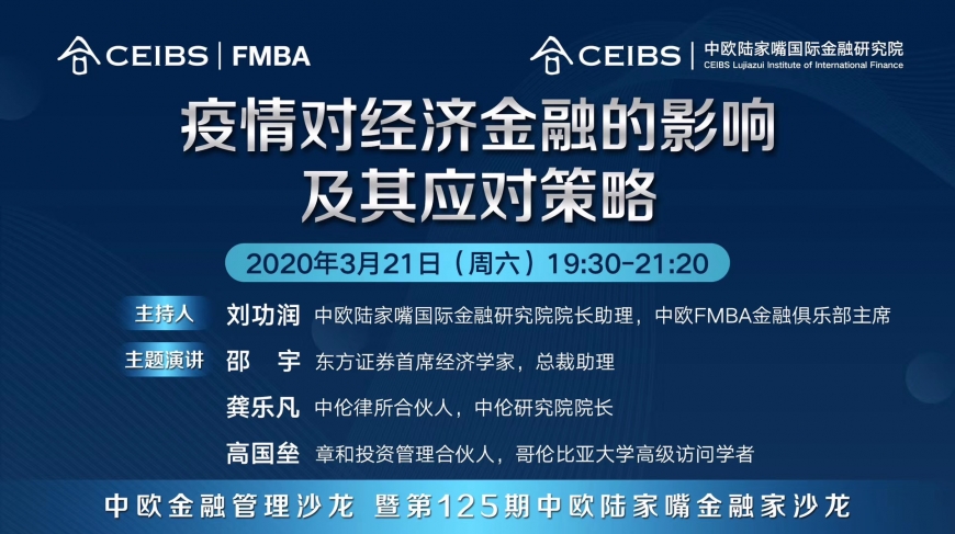 3月21日,中欧陆家嘴国际金融研究院与中欧FMBA课程部联合主办中欧金融管理沙龙暨第125期中欧陆家嘴金融家沙龙,以云分享的形式就新冠疫情对经济金融的影响及其应对策略进行了探讨。东方证券首席经济学家、总裁助理邵宇,中伦律所合伙人、中伦研究院院长龚乐凡,章和投资管理合伙人、哥伦比亚大学高级访问学者高国垒分别从宏观经济、财税政策、股权激励等方面发表了真知灼见,中欧FMBA课程部行政主任朱炎应邀致欢迎辞,中欧陆家嘴国际金融研究院院长助理、中欧FMBA金融俱乐部主席刘功润主持沙龙活动。本场活动由中欧FMBA金融俱乐部承办,包括中欧FMBA在校同学、校友及各界人士共2000多人次线上参与。
