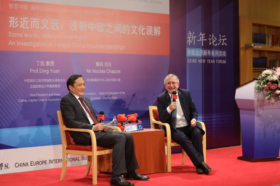 12月12日,中欧北京新年论坛在国家大剧院举办。欧盟驻华大使郁白(Nicolas Chapuis)先生应邀发表主题演讲《形近而义远——浅析中欧之间的文化误解》。中欧国际工商学院院长汪泓出席论坛并致辞。中欧国际工商学院副院长兼教务长丁远与郁白大使对话,探讨如何弥合差异,促进双方的互信与合作。