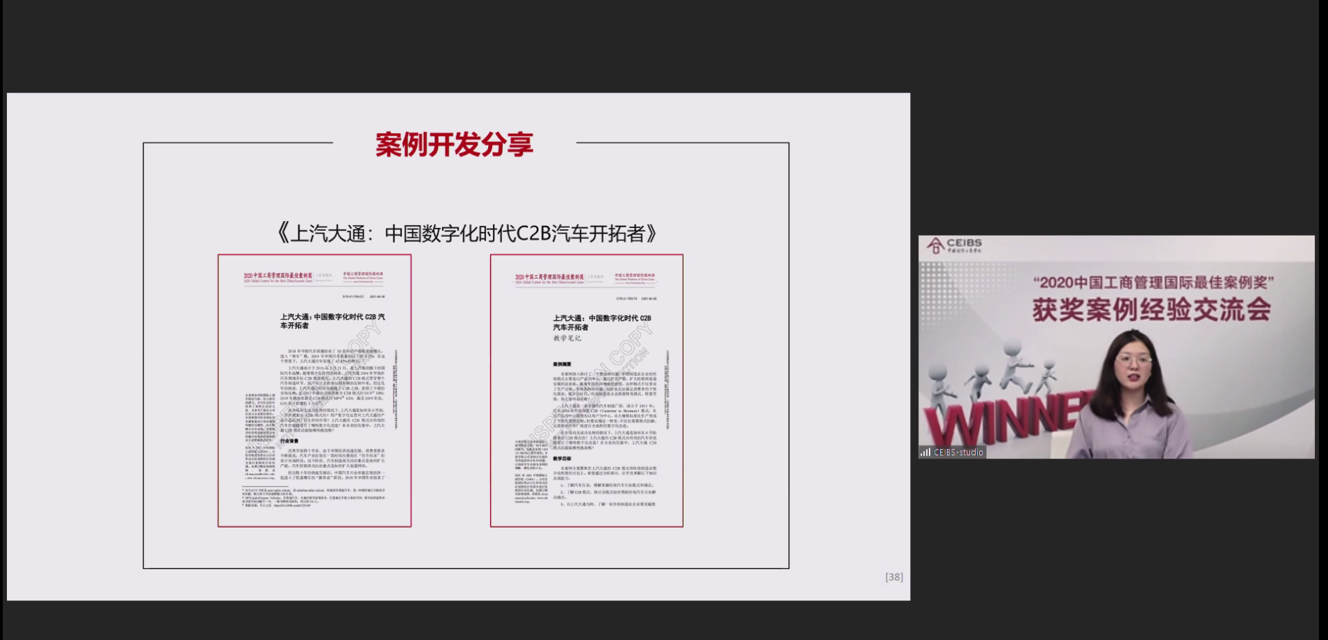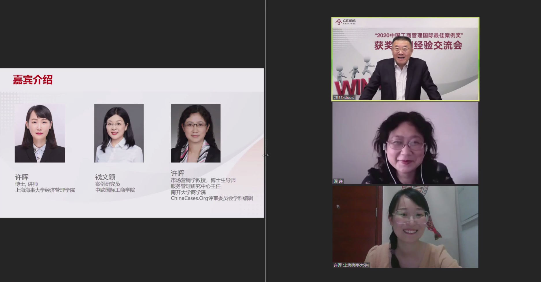 5月23日,中欧国际工商学院案例中心(以下简称“中欧案例中心”)在线举办“2020中国工商管理国际最佳案例奖”获奖案例经验交流会。本次活动由中欧案例中心主任、会计学教授、ChinaCases.Org主编陈世敏教授主持,“2020中国工商管理国际最佳案例奖”的两位获奖作者——上海海事大学经济管理学院讲师许晖博士、中欧案例中心研究员钱文颖共同主讲,南开大学商学院教授、ChinaCases.Org评审委员会学科编辑许晖教授现场点评。两位作者从自己的获奖案例出发,分享了案例的开发历程和体会,也详细解读了如何开发受课堂欢迎的高质量教学案例。学科编辑许晖教授则从案例评审的角度对两位作者的案例进行了深度点评。作为“中国工商管理国际最佳案例奖”的推广暨2021年竞赛的预热,本次活动受到了广大商学院教师的热情关注,在线参与人数峰值达2100余人次。