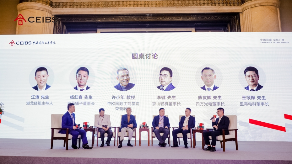 6月23日,中欧国际工商学院(以下简称“中欧”)2021第六届思创会武汉站成功举办。本次活动以“以思想破冰引领企业突围”为主题,中欧终身荣誉教授许小年,中欧院长助理李瑗瑗,四方光电董事长熊友辉(中欧EMBA2014),京山轻机董事长李健(中欧管理文凭课程2003、中欧CEO班2015),良品铺子董事长杨红春(中欧AMP14班),里得电科董事长王颂锋(中欧EMBA2020)等嘉宾,与现场400逾位观众,围绕企业创新、企业转型等多个话题,展开了热烈讨论。新华社、中新社、21世纪经济报道、湖北日报、长江日报、楚天都市报、湖北电视台等多家主流媒体现场参与报道。