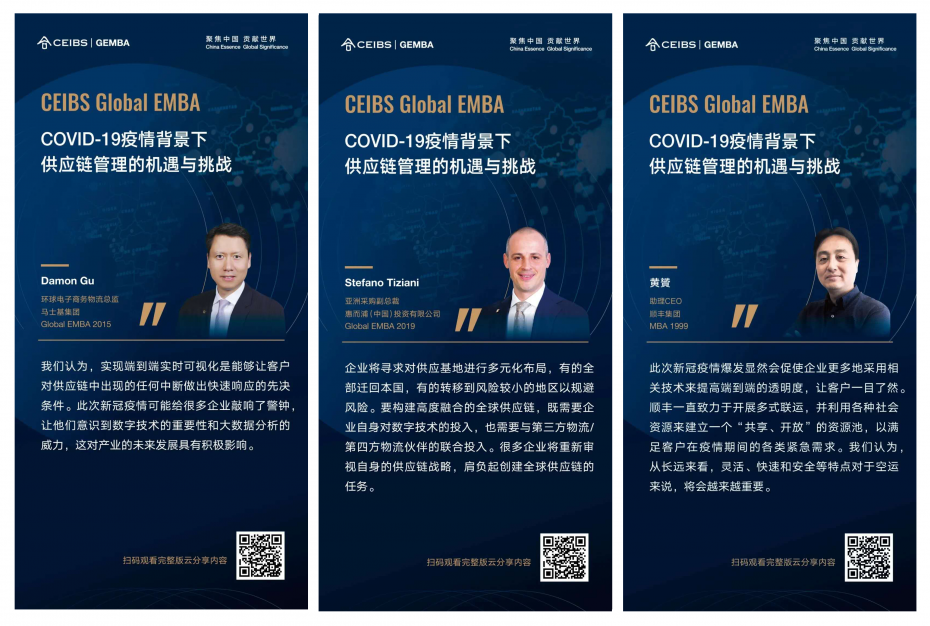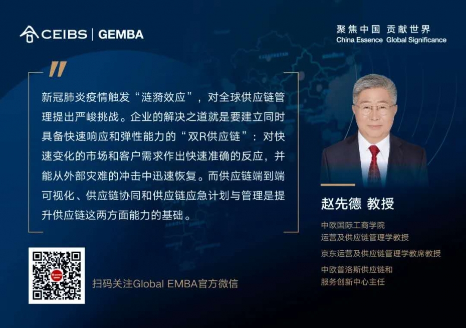 日前,中欧Global EMBA特邀供应链领域专家赵先德教授举办了一场线上分享会,同时邀请到来自顺丰、惠而浦、马士基的三位深耕供应链领域的高管校友,分享他们在应对本次疫情中的实践经验以及对供应链战略的思考。有近400位供应链领域高管参与了本次云分享,并共同针对企业在疫情期间的供应链创新实践、供应链战略与能力调整,以及供应链的疫后发展趋势展开深入讨论。