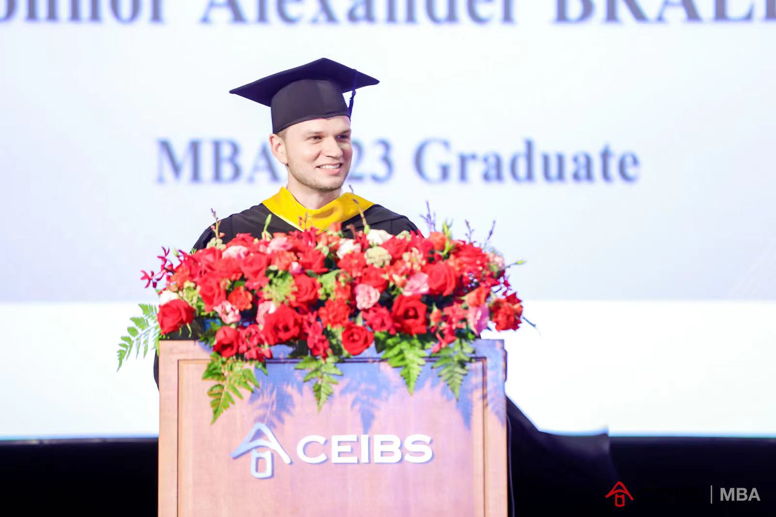 毕业生代表范晓蕾和康纳(Connor BRALLA)依次登台发言。范晓蕾表示无论顺境还是逆境,无论商业世界会带来什么,都要始终忠于自己,并与所有同学们共勉。她表示:“MBA的价值基于自我发现。自我认知是我们在这个不确定的世界中设定方向的导航器,而不是自负或自我贬低。通过MBA的学习,我有机会通过每一堂课,和大家的每一次讨论,了解真实的自我,这让我觉得非常难得。”