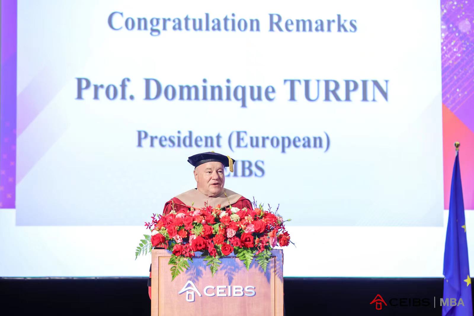 随后,杜道明院长(欧方)给毕业生送上了祝福和期望,他希望同学们能够铭记自己的价值观和中欧所坚持的具有责任心的领导力,并重点指出好奇心与责任心相结合所带来的好处。他说:“当你在5年、10年,甚至25年后回想起自己在中欧MBA的经历时,什么才是你真正学到的?我想分享的三点是:做一个负责任的领导者,树立你的价值观,以及保持好奇开放的心态。中欧的教学艺术就是唤醒年轻人本能的好奇心,并驱动他们不断满足这种好奇心。带着在这里学到的一切,你们已经为成功做好了充分的准备,并将会对他人的生活产生积极的影响,对此,我深信不疑。”