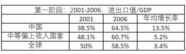 我将21世纪的中国对外经济历史分为4个阶段:第一阶段是2001-2006年,即中国入世后的5年,这个时期仍处于全球化阶段,全球化在此期间走向尾声。2001年-2006年,中国进出口贸易总额占GDP的比重,也称为贸易开放度,从38.5%上升到64.5%,年均增速13.5%。这个速度远快于可以与中国对标的中等偏上收入国家群体,比如巴西、俄罗斯等。中等收入偏上国家的贸易开放度,2001年为48.1%,高于中国;2006年为60.7%,低于中国,年均增长率5.2%。同期,全球贸易开放度从50%上升到58.5%,年均增长率3.4%。