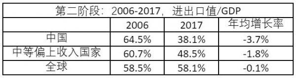 第二阶段是2006-2017年,为逆全球化阶段。贸易开放度的指标,中国从2006年的64.5%下降到了2017年的38.1%,年平均增长率为-3.7%。中等偏上收入国家在这段时间的贸易开放度以-1.8%的速度下降,全球则以-0.1%的速度下降。