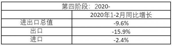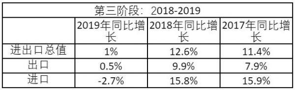 第三阶段是2018-2019年,中美贸易摩擦阶段。数据表明,中美贸易摩擦的负面影响有个时滞,是在2019年开始显现的。中国的进出口总额增长率,2018年为12.6%,2019年跌至1%。中国出口的增长率,2018年为9.9%,2019年跌至0.5%。中国进口的增长率则反映了中国经济的状况。2017年,中国经济超预期增长,当年进口增长率为 15.9%。2018年时中美贸易摩擦刚开始,其负面影响尚未显现,当年进口增长率仍高达15.8%。到了2019年,进口大幅下滑,增长率为-2.7%。