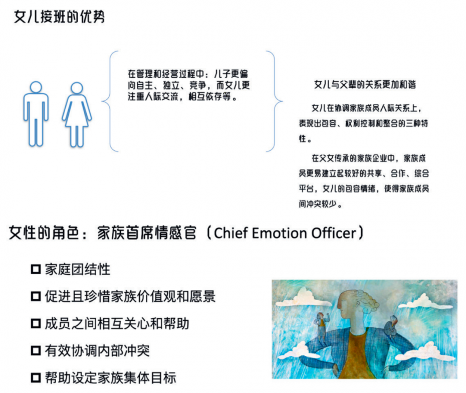 这些都是女性能够扮演的角色。当然我觉得女性在家族企业里扮演的一个很重要的角色是家庭首席情感官。一个家族一定要有人把所有人凝聚在一起,这个角色往往是妈妈在扮演。女儿长大以后,也可以扮演家庭的CEO角色,促进家族团结,有效协调内部冲突,帮助设定家族集体目标。