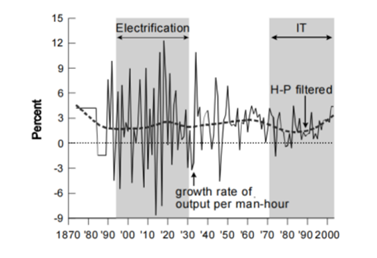 1870年尚处于蒸气动力时代,1890年电力时代开启,从1870-1890年的这段时期,生产率增长是在下降的。直到1915年之后,由于电机的普及以及集中电网的广泛建立,电力更加广泛地使用,生产率才开始上升。