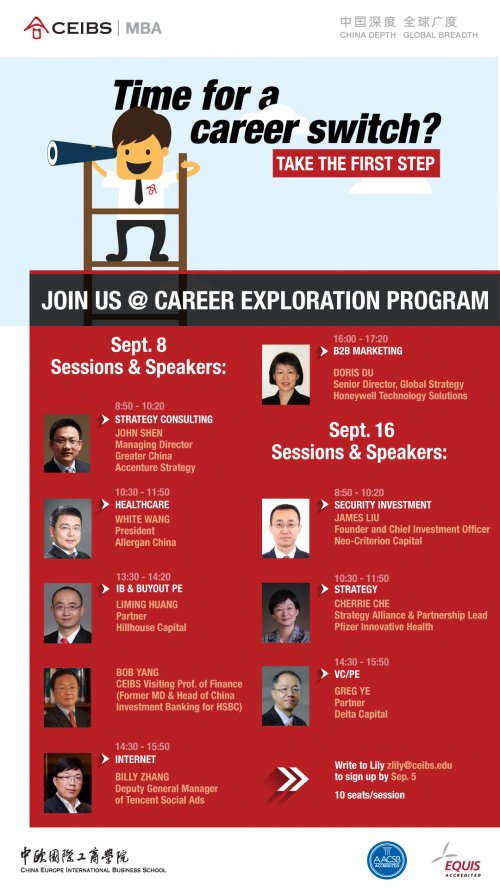 - 2018-09-19MBA学员如何成功转型加入热门行业? 医疗、管理咨询、VC/PE、互联网、工业品、投行、证券投资等行业需要怎样的人才? 在过去的两周里,中欧职业发展中心力邀多位来自上述行业和领域的资深人士,通过多场主题活动与MBA学生分享了独到的行业见解,并就职业发展提出了宝贵建议。 管理咨询: 中欧MBA校友、埃森哲董事总经理沈军在咨询行业有丰富的从业经验。他指出,战略需要企业专注于其核心能力,在有限资源的情况下实现公司价值的最大化。他强调了成为一名管理咨询顾问所必需的技能,包括:基于事实的分析、逻辑推理能力、战略思维、沟通能力与谈判能力。此外,他通过一些工作中的案例指出了激励他人、调动组织积极性的…