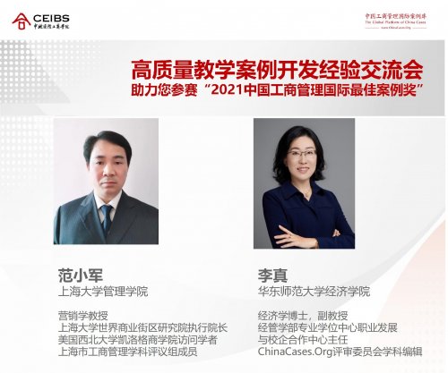 - 2021-08-142021年8月14日,中欧国际工商学院案例中心在线举办“高质量教学案例开发经验交流会”,为2021年竞赛开启预热。本次活动由中欧国际工商学院案例中心主任、会计学教授、ChinaCases.Org主编陈世敏教授主持,“2020中国工商管理国际最佳案例奖”一等奖获得者——上海大学管理学院营销学教授范小军主讲,华东师范大学经济学院副教授、ChinaCases.Org评审委员会学科编辑李真点评。范小军教授复盘了获奖案例的写作历程和方法,李真教授则结合竞赛评审的几个维度对案例进行深入点评。本场活动的参与人数达到1,761人次,受到广泛关注。 范小军教授从选题思路和方法、案例设计、讨论问题选择、教学知识…