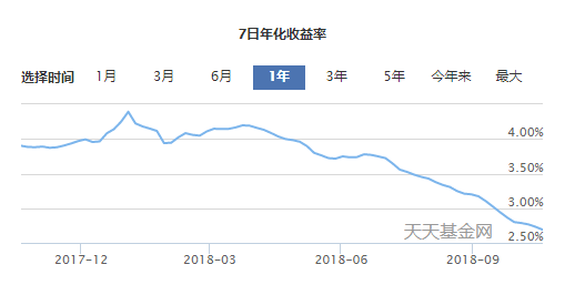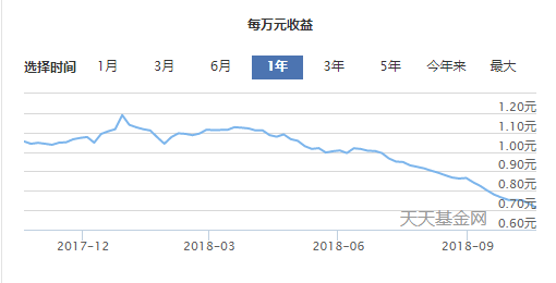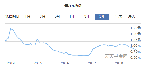 此外,每万元的收益情况整体来看也是在逐渐下降,与近5年内2013年12月29日的最高值1.7886元相比,2018年10月20日的数据显示为0.7126元,跌幅为60.16%。如下图: