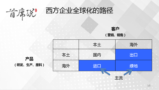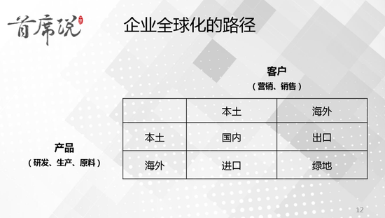 把产品和客户做一个2X2列表,如果产品是本土造、卖给本土客户就是国内经营;如果产品是本土造、卖给海外客户这是出口;如果产品是在海外造,卖到国内市场,这是进口;还有一个概念是绿地经营,直接在海外生产制造产品并直接卖给当地的海外市场,比方说美国通用汽车在上海造汽车并卖给中国消费者。
