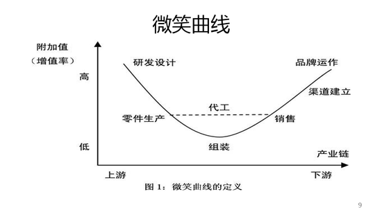 在整个价值链中,把产品从无到有做出来的这些研发设计的上游企业,以及负责品牌运作和渠道建立的企业的下游,往往分享更多价值。处于生产链中游的原材料供应、生产工厂以及最底层销售,分享的价值相对是少的。