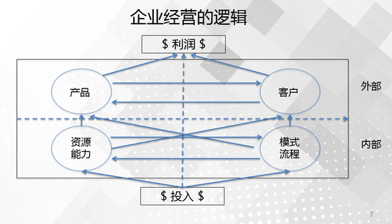再来看企业经营的逻辑,从企业内部来看,我们投入的资源不能直接变成产品,也不能直接获得客户,为了做出有竞争力的产品,获得大规模的忠诚客户,企业需要相应的资源禀赋,需要相应的能力,需要有想象力的商业模式和扎实的业务流程,这些要素是企业资源投入的重点所在。