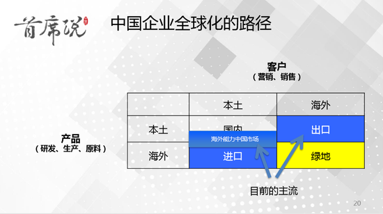 中国企业全球化的主流路径,一是出口,我们生产的产品卖到海外,出口比重确实很高;另一个是通过获取海外能力来服务中国市场,这是目前中国企业在全球化方面表现出来的特色。现阶段,只有少数中国企业在海外进行绿地经营。