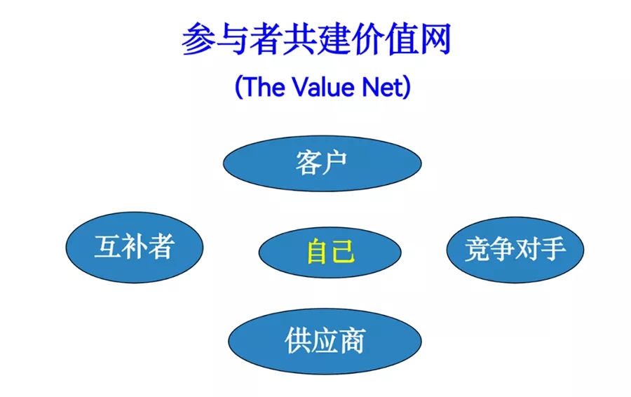 识别参与者可以用价值网来分析。参与者有五类:客户、对手、供应商、互补者,还有“我”。