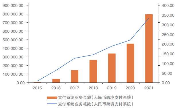 随着人民币国际化的进程不断加快,CIPS的交易规模与日俱增。2021年,CIPS的业务笔数达到了334.2万笔,业务金额达到了79.6万亿元,分别较2020年上升了51.5%和75.8%;日均处理规模也分别达到了1.34万笔和3 184亿元。