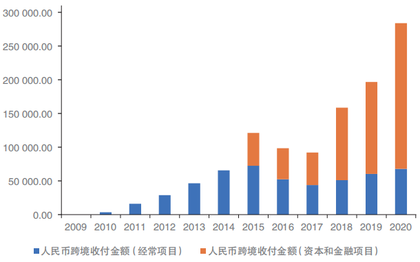 其次是通过加强资本市场建设,吸引离岸人民币投资,增强人民币国际化的影响力。根据央行公布的数据,2020年人民币跨境收付金额28.39万亿元,其中,经常项目收付金额为6.77万亿元,占比23.8%;资本和金融项目收付金额21.61万亿元,占比76%。具体而言,直接投资、证券投资、跨境融资收付金融分别占资本项目收付金额的17.7%、76.4%和4.3%。从历年人民币跨境收付金额的图中(图9)可以看到,经常项目也即贸易结算带来的人民币跨境收付规模虽有所扩大,但更主要的增量规模来源于资本和金融项目,尤其是证券投资。