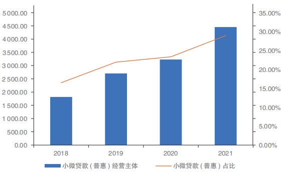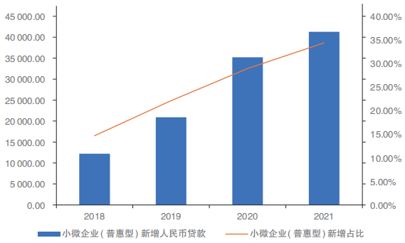 根据央行的统计,自2018年以来我国的普惠型小微企业贷款的新增贷款金额和占比不断提高,2021年共新增普惠型小微企业贷款4.13万亿,占比达到了所有企业新增贷款的34.4%;普惠型小微企业授信主体超4400万户,占比达到约29%。