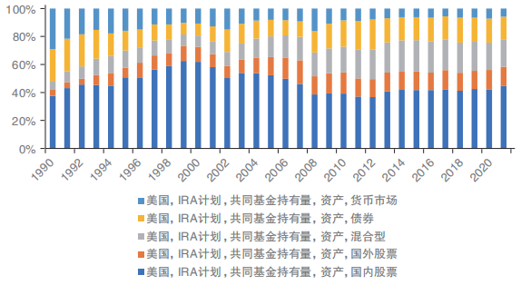 而从美国IRA的各资产投向来看,共同基金是绝对主力。自1980年来,共同基金市场占比从3%加速上升,并在1996年突破40%,随后一直维持在这一水平之上,最高于2005年达到52%,2021年为45%;通过证券公司经纪账户投资其他证券资产的市场占比从1980年的5%上升至2021年的46%;而商业银行的市场份额则从82%急剧下降到了2021年的5%。而从IRA账户持有的共同基金类型看,截至2021年底,IRA账户所投共同基金的资产配置类型为国内股票型45%、国际股票型14%、混合型19%、债券型16%、货币市场型6%。