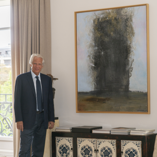 走进德维尔潘位于巴黎凯旋门附近的家,也能感受到其儒雅低调却饱览世界文化的艺术品位——大幅的安塞尔姆·基弗作品挂在走廊、餐厅与客厅最醒目的位置,会客厅窗边两幅赵无极的作品与窗外巴黎的美景相映成辉,书架上还摆放着许多件非洲土著艺术雕塑作品。德维尔潘个人藏品的核心主题围绕着“记忆”与“历史”展开,每件藏品都反映着他的经历和世界观:以开放的心态去拥抱差异,通过走向世界去理解自我文化,并去探寻高于个人与国家利益的普世价值。