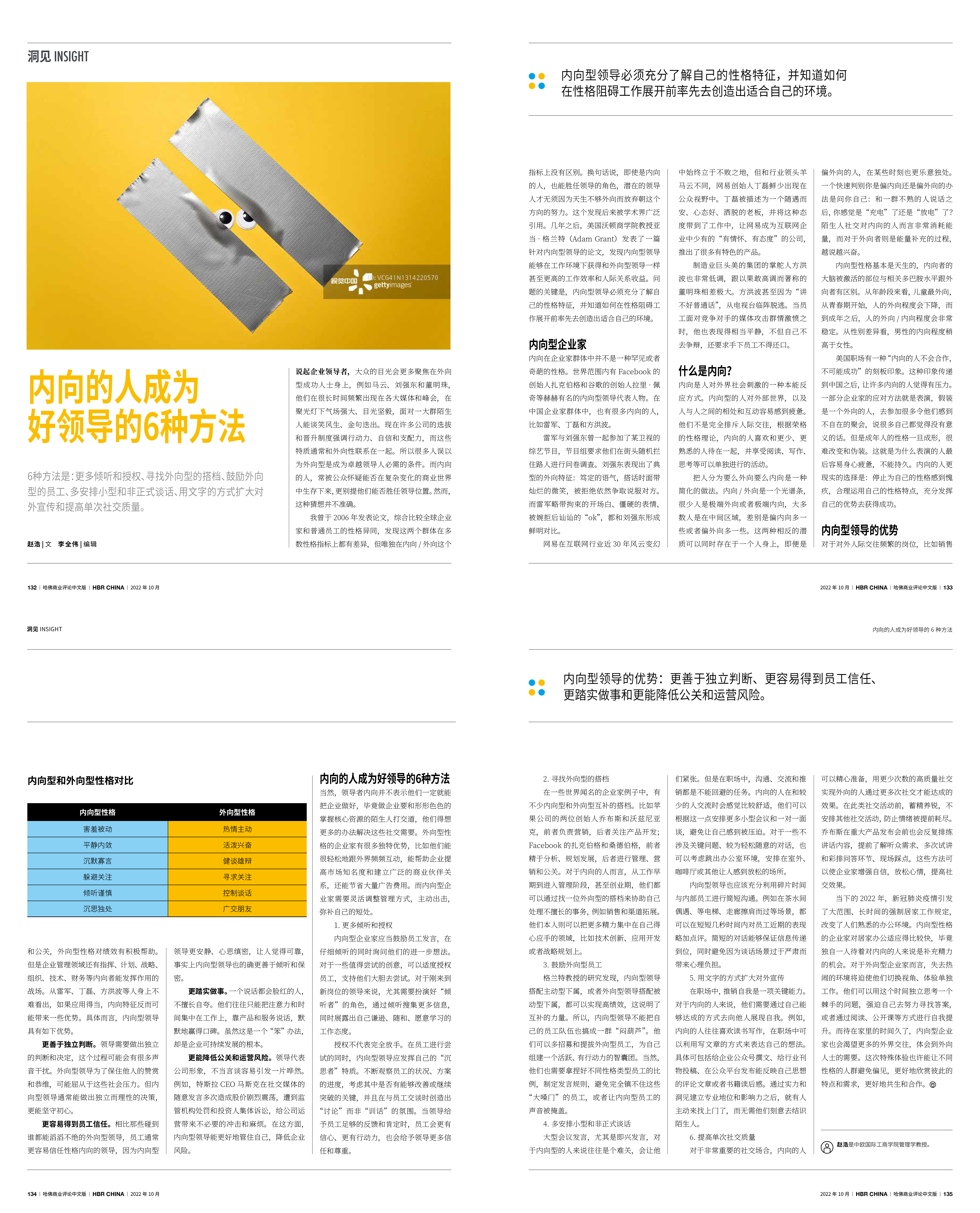 中欧国际工商学院管理学教授赵浩曾于2006年发表论文,综合比较全球企业家和普通员工的性格异同,他发现两个群体之间在多数性格指标上都有差异,但唯独在内向/外向这个指标上没有区别。换句话说,即使是内向的人,也能胜任领导的角色,潜在的领导人才无须因为天生不够外向而放弃这个方向的努力。