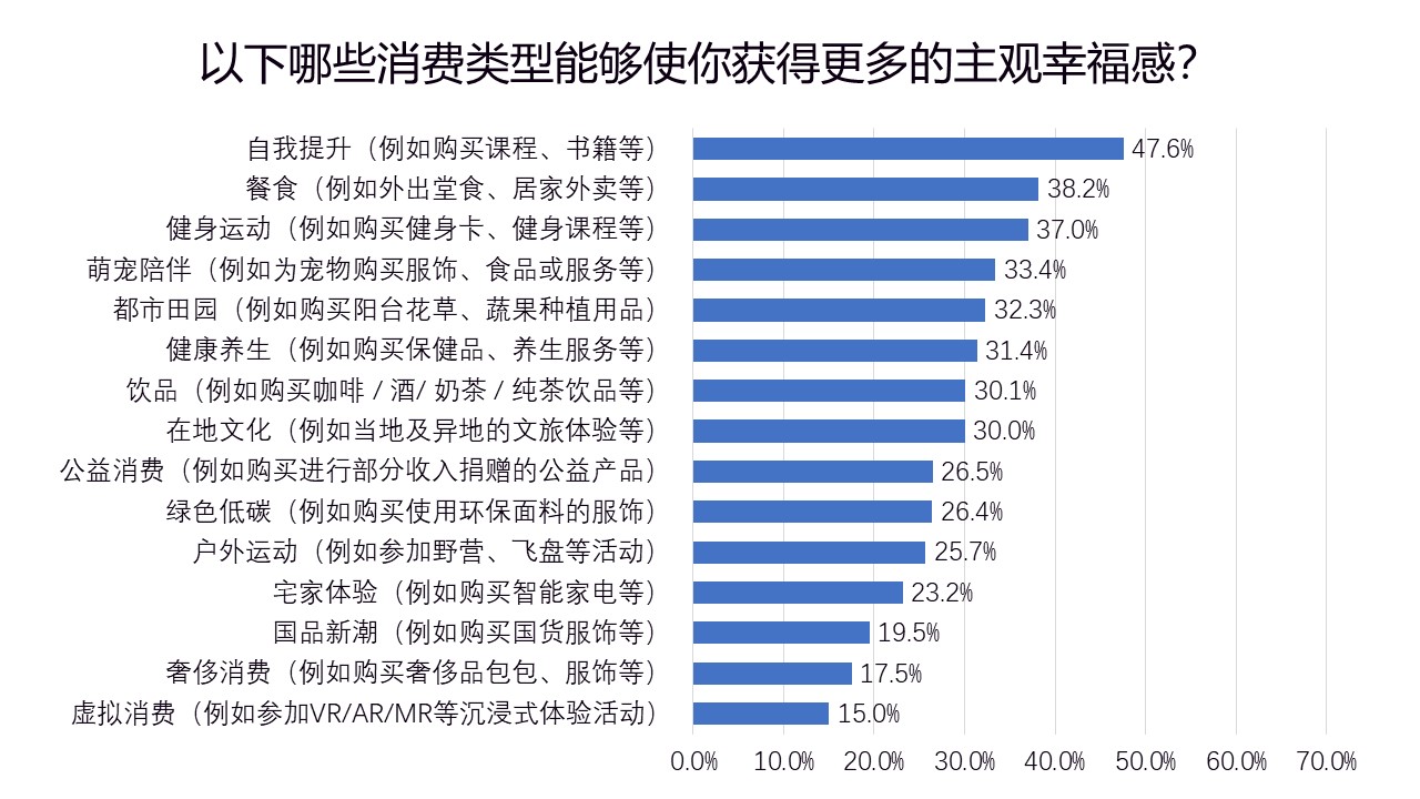 针对以下众多的消费类型,认为通过自我提升(例如购买课程、书籍等),餐食(例如外出堂食、居家外卖等)和健身运动(例如购买健身卡、健身课程等)能获得更多主观幸福感的人群占比较高。